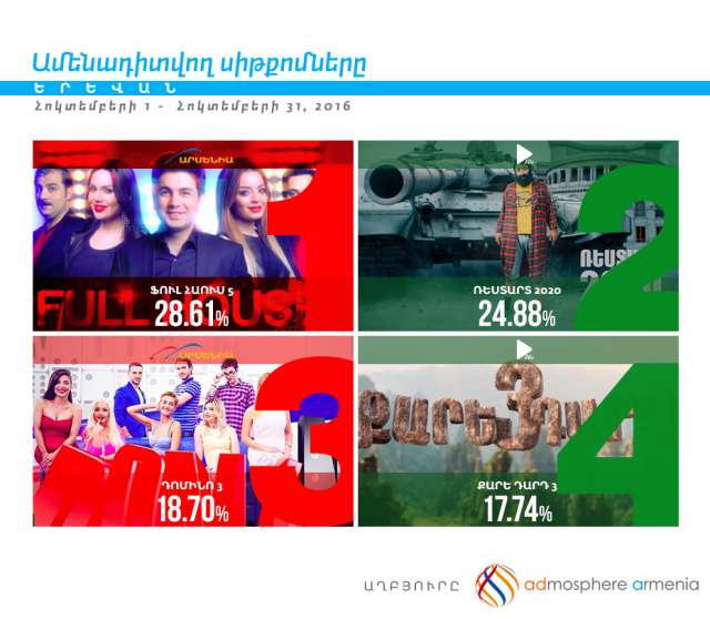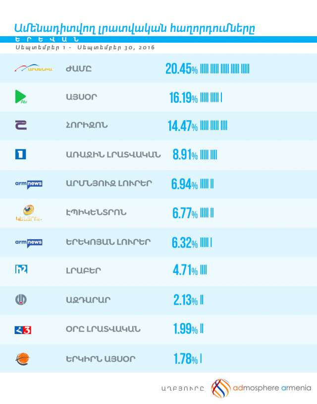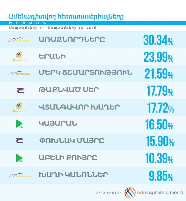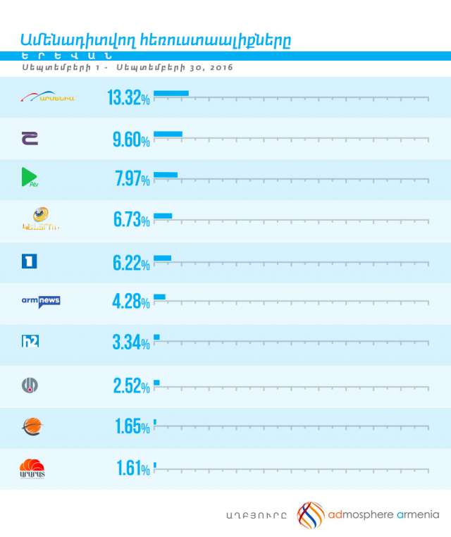 Եվ այսպես, 2016 թվականի սեպտեմբեր ամսվա ամենադիտվող հեռուստաալիքը եղել է «Արմենիա TV»-ն՝ շուկայի 13.32 տոկոս մասնաբաժնով: Երկրորդ տեղում «Շանթ»-ն է, երրորդում՝ «ATV» հեռուստաալիքը: