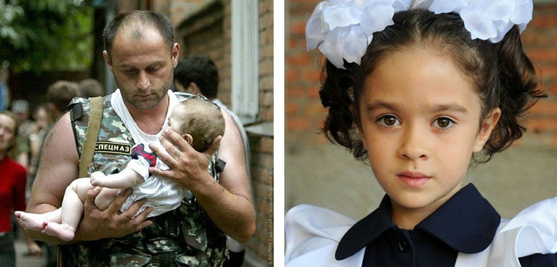Левый снимок сделан 2-го сентября 2004 г., когда удалось освободить 25 человек - матерей с грудными детьми.