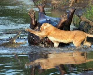 Ինչպես է էգ առյուծը պայքարում կոկորդիլոսների դեմ (լուսանկարներ)