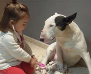Փոքրիկ աղջնակը զննում է բուլտերիերին