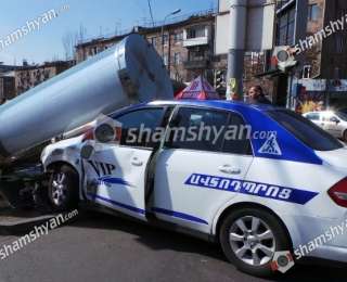 ԲԱՑԱՌԻԿ ՏԵՍԱՆՅՈՒԹ` Երևանի Կոմիտաս պողոտայի և Տիգրանյան փողոցի խաչմերուկում ուսումնական պարապմունքի ժամանակ կին վարորդը Nissan-ով տապալում գովազդային վահանակը. ՖՈՏՈՌԵՊՈՐՏԱԺ