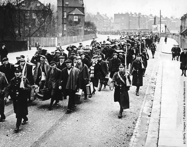 Առաջին աշխարհամարտի բռնկման ժամանակ նոր զորակոչիկները քայլում են զինված սպաների ընկերակցությամբ, 1914թ.: