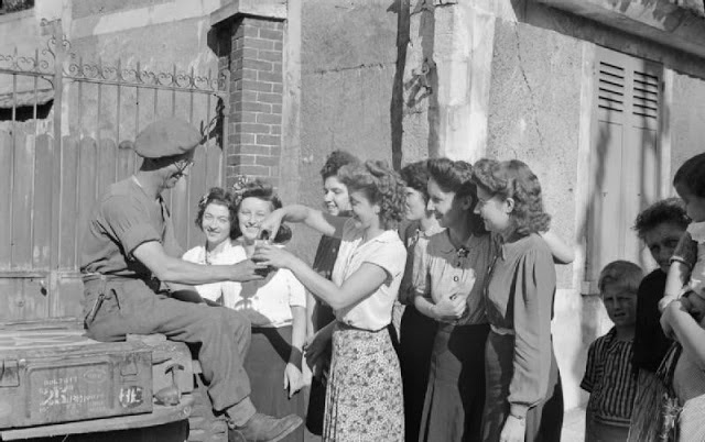Ֆրանսիայի քաղաքացիները Ֆրանսիայում բրիտանացի զինվորների հետ բաժակ են բարձրացնում, 1944թ.:
