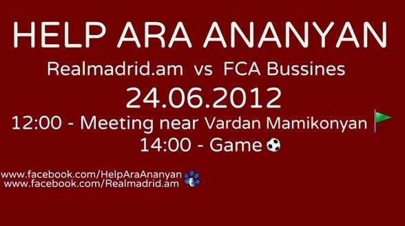 Կոչ ենք անում բոլորիդ. հունիսի 24-ին` կիրակի օրը, ներկա լինել Ֆիզիկական Կուլտուրայի Ինստիտուտի սպորտային դահլիճում (մուտքը Երվանդ Քոչար փողոցի կողմից, Սուրբ Գրիգոր Լուսավորիչ եկեղեցու հարևանությամբ) կայանալիք բարեգործական ֆուտբոլային հանդիպմանը: Աջակցել մադրիդիստներին ու օգնել Արային: Հիշեք, որ Ձեր նվիրաբերած յուրաքանչյուր դրամ կարող է շատ մեծ նշանակություն ունենալ Արայի համար: Հիշեք, որ Ձեր օգնությամբ փրկված մարդկային կյանքը կարող է այլ մարդկանց փրկության համար շատ կարևոր լինել: