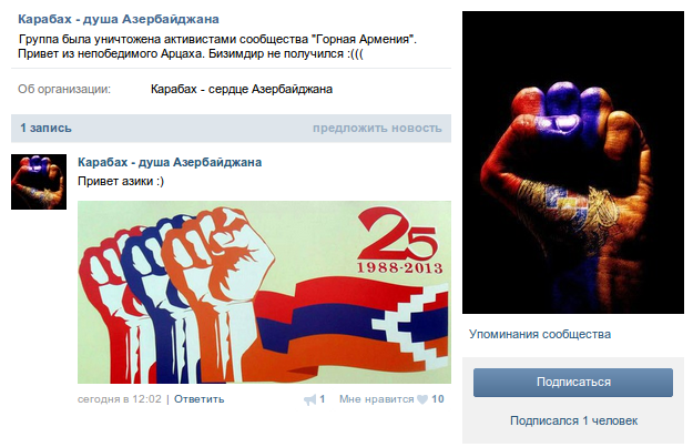 Հայկական Горная Армения VKontakte խմբի մասնակիցները վերացրել են երկու ադրբեջանական հայրենամոլական խմբեր՝ Карабах - душа Азербайджана և Нагорный Карабах ։