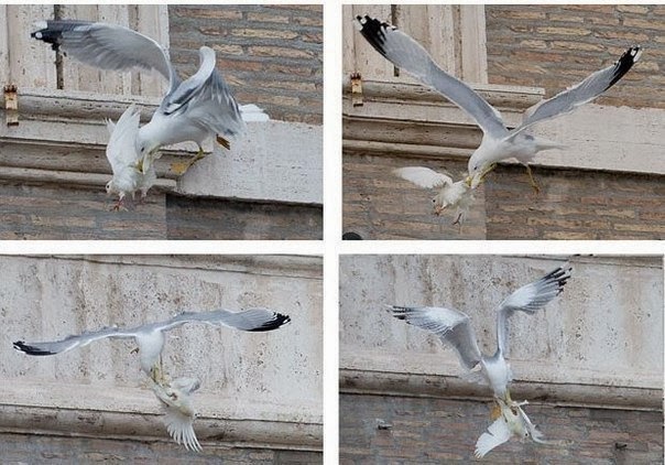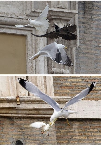 Հավատացյալների համար վատ նշանով ավարտվեց Հռոմի Պապ Ֆրանցիսկոսի մտահղցումը, երբ նա Ուկրաինայի ժողովրդի սրտերում «սեր և խաղաղություն» հաստատելու խոսքերից հետո որոշեց այն ամրագրել իր նախորդներից մեկի պես՝ երկինք բաց թողնելով խաղաղության աղավնիներին: Աղավնիները նոր էին բարձրացել երկինք, երբ նրանց վրա հարձակվեցին սկզբում ագռավը, ապա ճայը: Աղավնիներին մի կերպ հաջողվեց դուրս պրծնել թռչունների ճանկերից և լքել Վատիկանի հրապարակը: Սակայն հազարավոր հավատացյալներ ամբողջ աշխարհից դա որպես երկնային նախազգուշացման նշան ընդունեցին: