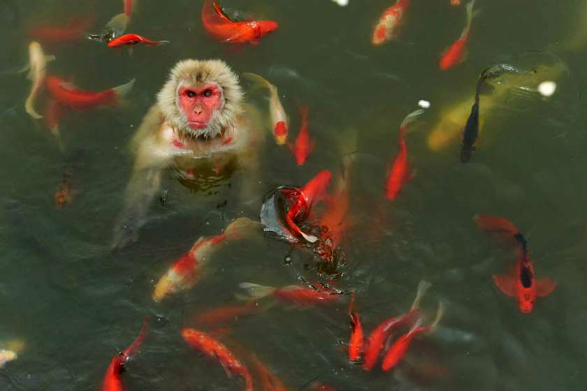 Չինաստանի բնապահպանական այգում կապիկը շրջապատված է ծածաններով: