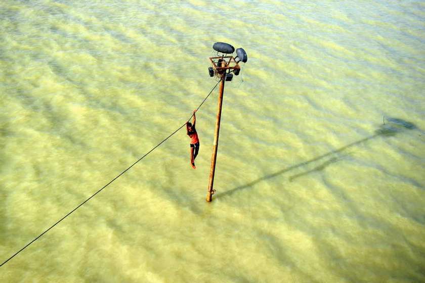 Երիտասարդ հնդիկն անցնում է վարարած Գանգես գետը: