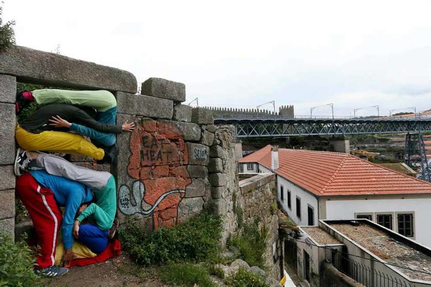 Անհոգ ընկերները լրացնում են պատն իրենց մարմիններով՝ «Մարմինները քաղաքային տարածության մեջ» նախագծի շրջանակներում, Պորտուգալիա, Պորտու: