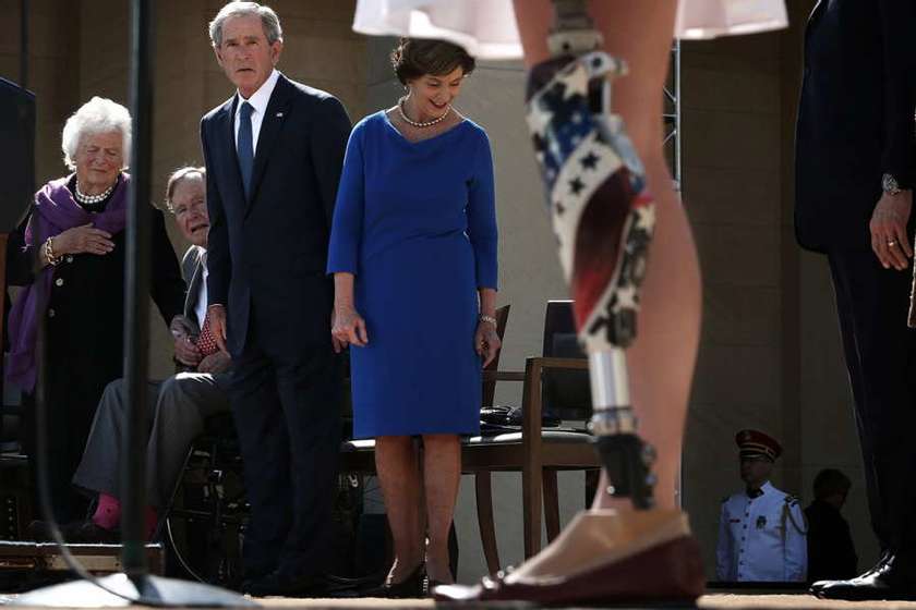 Ջորջ Բուշն ուշադրությամբ նայում է ամերիկացի առաջին կին լեյտենանտին՝ Մելիսսա Սթոքուելին, ով իրաքյան պատերազմի ժամանակ զրկվել է մի ոտքից: