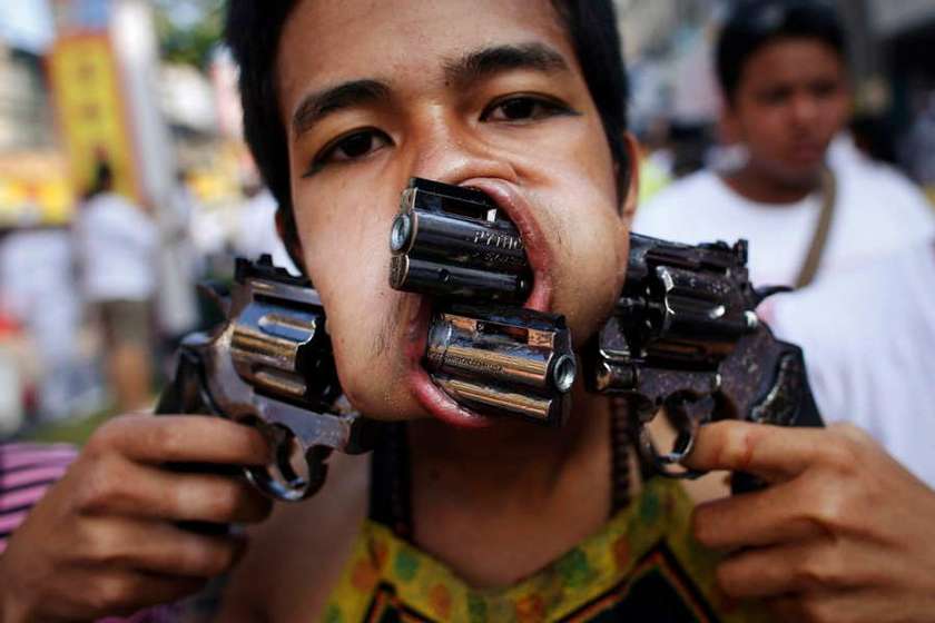 Այտերի մեջ մտցրած երկու ատրճանակներով չինացի վանականը մասնակցում է Փհուեթին՝ Թայլանդի ամենամյա բուսակերության փառատոնին: