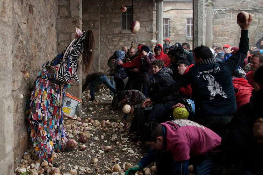 Մարդիկ միմյանց վրա շաղգամներ են նետում Jarramplas փառատոնի ժամանակ: