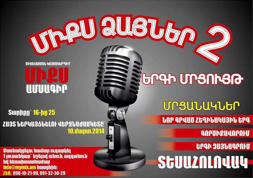 Մեկնարկում է «ՄԻՔՍ ՁԱՅՆԵՐ 2» երգի մրցույթը: Նախընտրական փուլին մասնակցելու համար ուղարկել մեկ լուսանկար՝ նշելով անուն, ազգանուն և հեռախոսահամար՝ [email protected] հասցեին: Հաղթողին, որպես մրցանակ, կտրվի իր համար գրված երգ, գործիքավորում և ձայնագրում, ինչպես նաև տեսահոլովակ: Միջոցառման կազմակերպիչ՝ «ՄԻՔՍ» ամսագիր: Միջոցառման ինֆորմացիոն գլխավոր գործընկեր՝ Blognews.am