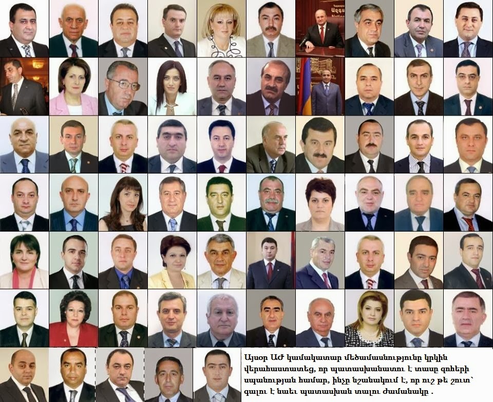 ՀՀԿ Ռոբերտ Սարգսյան, Սամվել Ֆարմանյան, Արթուր Ստեփանյան, Արտակ Սարգսյան, Արթուր Գեւորգյան, Ռուբեն Հովսեփյան, Կորյուն Նահապետյան, Գարեգին Նուշիկյան Մնացական Մնացականյան, Մուրադ Մուրադյան, Կարինե Պողոսյան, Արայիկ Գրիգորյան, Սեդրակ Սարոյան, Հրանտ Գրիգորյան, Ալեքսան Պետրոսյան,Մանվել Բադեյան, Կարեն Բոթոյան, Հակոբ Հակոբյան, Արկադի Համբարձումյան Կարեն Սարիբեկյան, Կարեն Կարապետյան, Արման Սահակյան, Հայկ Գրիգորյան, Արմեն Կարապետյան Աշոտ Արսենյան, Մարինե Մարաբյան, Հակոբ Հակոբյան, Հովիկ Աբրահամյան, Սամվել Նիկոյան Գալուստ Սահակյան, Ռազմիկ Զոհրաբյան, Գագիկ Մինասյան, Հովհաննես Սահակյան, Հերմինե Նաղդալյան, Դավիթ Հարությունյան, Էդուարդ Շարմազանով, Մանվել Գրիգորյան, Արտաշես Գեղամյան, Խոսրով Հարությունյան, Հայկ Բաբուխանյան, Արա Բաբլոյան, Կարինե Աճեմյան, Կարեն Ավագյան, Լեւոն Մարտիրոսյան, Մարգարիտ Եսայան, Վարդան Այվազյան, Ռուզաննա Մուրադյան, Նահապետ Գեւորգյան, Նաիրա Կարապետյան, Հովհաննես Սոֆոյան, Սպարտակ Մելիքյան, Շիրակ Թորոսյան, Արփինե Հովհաննիսյան, Արտակ Զաքարյան, Արայիկ Հովհաննիսյան, Արտակ Դավթյան Վոլոդյա Բադալյան, Մկրտիչ Մինասյան, Տաճատ Վարդապետյան: