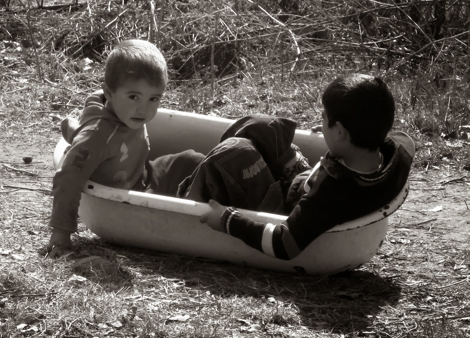 երեխաներ, որոնք ուրախանում են, երբ գտնում են չուգունե մի տաշտ և դարձնում սուպեր ավտոմեքենա,