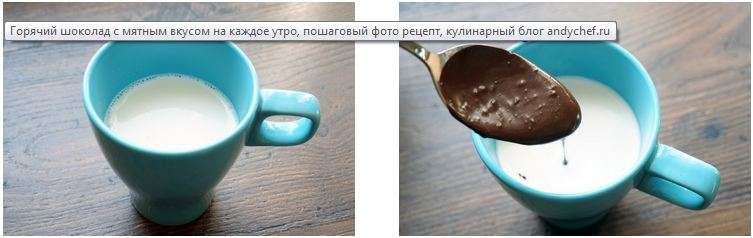 Իրար ենք խառնում սերուցքն ու կաթը և թույլ կրակի վրա եռացնում, երբ սկսի եռալ, ավելացնում ենք անանուխի տերևները: Քամիչի օգնությամբ այս ամենը լցնում ենք շոկոլադի վրա, որպեսզի անանուխի տերևները առանձնացնենք: Դրեք կրակի վրա և լավ խառնեք, մինչև շոկոլադը հալվի և համասեռ զանգված ստանաք: Պատրաստի շոկոլադը կարող եք օգտագործել նույն օրը 2-3 ժամ հետո, կամ ավելի լավ է հաջորդ օրը, ավելացրեք կաթին և վայելեք :)