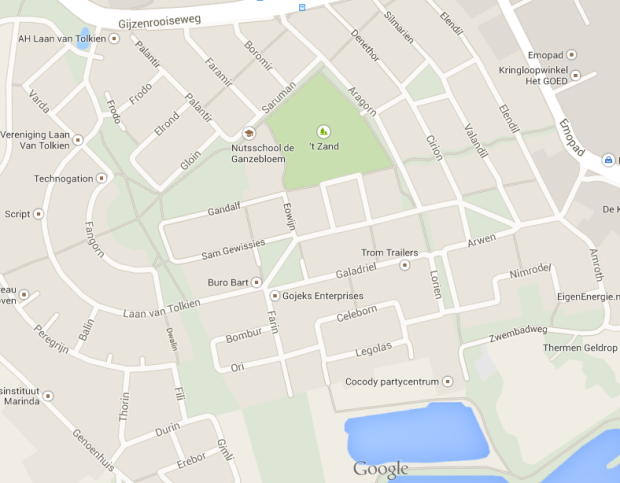 Միայն թե գլխավոր հերոսներից մեկին՝ Բիլբոյին մոռացել են: Չնայած, նրա անունը հիշատակվում է մեկ այլ հոլանդական քաղաքում՝ Սոմերենում, որտեղ «Frodo-Bilbo B.V.» անվանումով ընկերություն կա: Իսկ Գելդրոպում հերոսների անուններով են կոչվում փողոցները, նրբանցքները, որոնք հատվում են միկրոշրջանի գլխավոր՝ Թոլքինի անվան փողոցի հետ: Այնտեղ կա դպրոց՝ Սարումանի 1 հասցեի տակ, թենիսի ակումբ՝ Ֆարգորնի 23 հասցեում և ֆիզիոթերապևտների խորհուրդ՝ Լեգոլասի 7 հասցեում: Ահա և միկրոշրջանի քարտեզը: Եթե սիրում եք այդ ֆանտաստիկ գրականությունը, ապա այստեղ կգտնեք ձեր իմացած հերոսների անուններով փողոցներ: