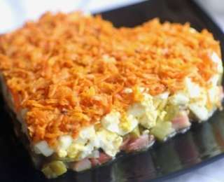 Գազարտ մանր քերիչով անցկացնել, տապակել ձեթի մեջ, այնուհետև համեմել աղով և պղպեղով։ Մարինացված վարունգը նույնպես մանր կտրատել։ Անհրաժեշտ է տապակած սոխի և գազարի ձեթը քամել նախապես։