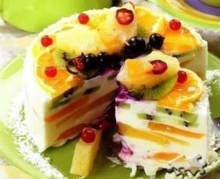 Ափսեի մեջ դնել մանդարինի առանձին կտորները, լցնել կաթնոշոռի զանգվածի մի մասը, ապա վրան դնել կտրատած կիևիները, կրկին լցնել կաթնաշոռի զանգվածը: Կաթնաշոռի մնացած զանգվածի մեջ լցնել պահածոյացված անանասը և դեղձը և լցնել վրան: Դնել սառնարանի մեջ 3-4 ժամ:
