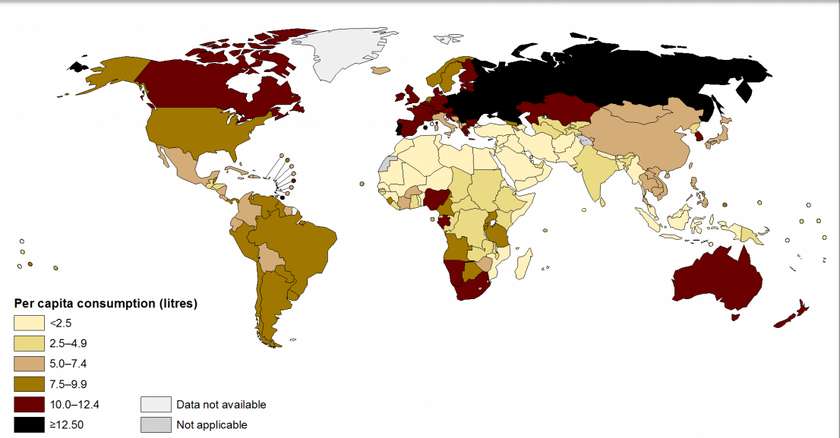 Ստորև ներկայացված է Առողջապահության համաշխարհային կազմակերպության կողմից հրատարակված քարտեզը, որի վրա պատկերված է, թե աշխարհի տարբեր երկրների բնակիչները միջին հաշվարկներով որքան ալկոհոլ են օգտագործում: Ինչպես երևում է քարտեզից, ալկոհոլն ամենից լայն սպառում ունի ռուսների ու նրանց հարևան ազգերի շրջանում: Ալկոհոլի սպառման մակարդակը բավականին բարձր է նաև Պորտուգալիայում, Գրենադայում ու Անդորրայում: Ըստ 2010 թ.-ին անցկացված հետազոտության տվյալների՝ այս երկրների՝ 15 տարեկանից բարձր յուրաքանչյուր բնակիչ խմում է 12.5 լիտր ալկոհոլ: Առողջապահության համաշխարհային կազմակերպության զեկույցի մեջ նշվում է, որ հետազոտության մասնակիցների 48 %-ն առհասարակ խուսափում է ալկոհոլի օգտագործումից: