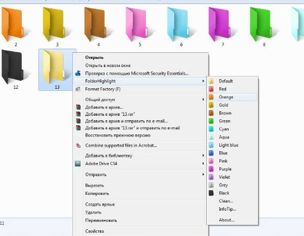 Ծրագիրը տեղադրելուց հետո,սեղմեք մկնիկի աջ կոճակը այն թղթապանակի վրա,որի գույնը ցանկանում եք փոփոխել,գտեք FolderHighlight և կտեսնեք կույները:Սեղմելով դրանցից ցանկացածի վրա,ձեր թղթապանակը կստանա նոր երանգ: