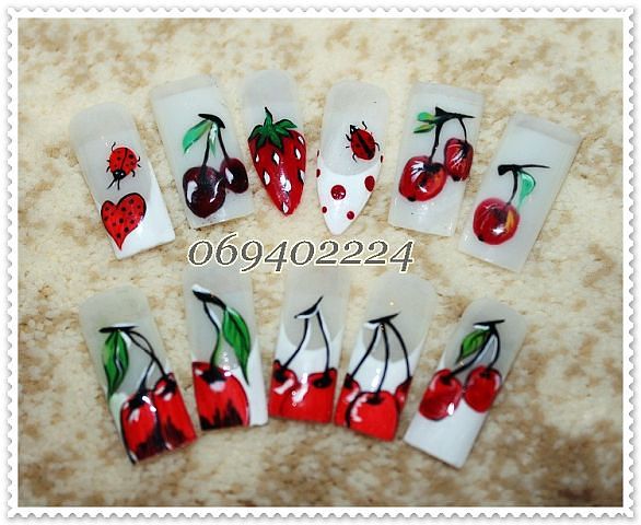 8. Այսպես դեռ ժամանակ ունես, կարող ես շատ հետաքրքիր գործով զբաղվել, երեւակայությանդ մի քիչ զոռ տուր, եւ ինչ որ հետաքրքիր մանիկյուր արա, ասենք օրինակ ձմերուկներ նկարիր եղունգներիդ կամ բալ, դրանք ամառային այս թեմատիկայով են: