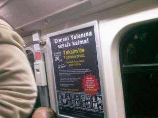 Հակահայկական ակցիա Ստամբուլում: Բաներները հետևյալ նշանակությունն ունենն՝ Մի հիմարացեք հայկական ստից (Ermeni Yalanlarina Kanma!): Ի դեպ այսպիսի հայտարարություններ կտեղադրվեն Ստամբուլյան մետրոներում և մեծ փողոցներում
