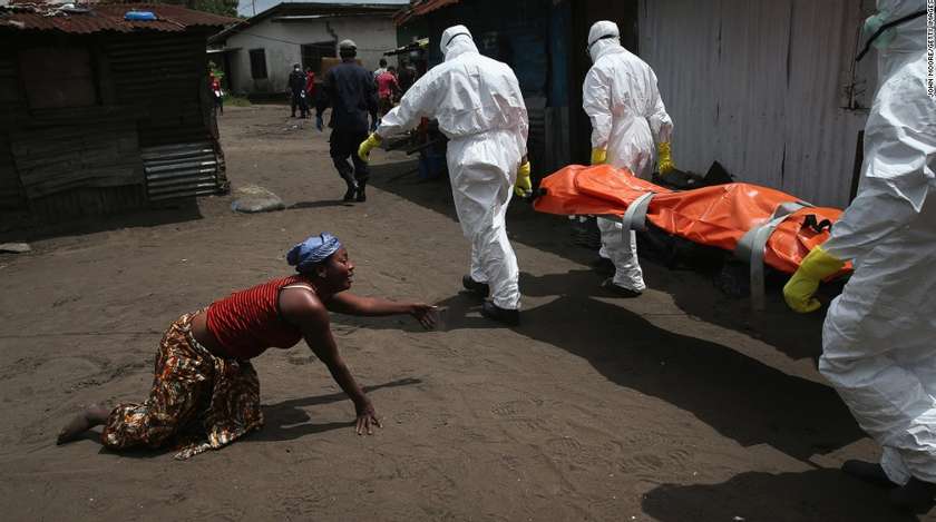 Կինը ծնկաչոք սողում է էբոլայից մահացած քրոջ մարմնի մոտ, որն բուժաշխատակիցները հեռացնում են դիակիզման նպատակով։ Էբոլայի վերջին բռնկումն Աֆրիկայում երբևէ գրանցված ամենամահացուն էր, որն ընդհանուր առմամբ արդեն 4000 մարդու կյանք է խլել։ Հոկտեմբեր 10, Մոնրովիա, Լիբերիա։