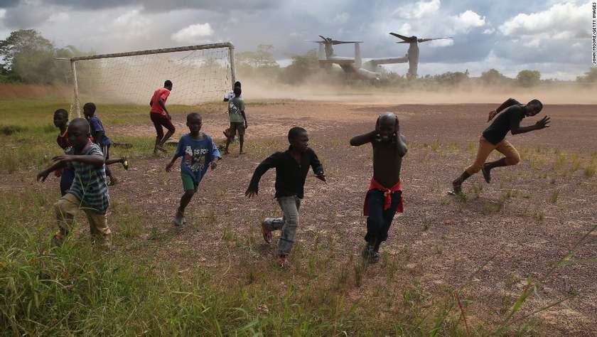 Հոկտեմբերի 15-ին տղաները փախչում են Լիբերիայի Տուբմանբուրգ բնակավայրում Էբոլայի բուժման համար նախատեսված կենտրոնի կառուցման վայրից թռչող ԱՄՆ ռազմական ինքնաթիռի թողած փոշուց։ Սա առաջինն է էբոլայի բուժումն իրականացնելու նպատակով կառուցվող այն 17 կենտրոններից, որ Լիբերիայի բանակի զինվորներն ու ամերիկյան զորքերը կկառուցեն միասնական ուժերով։