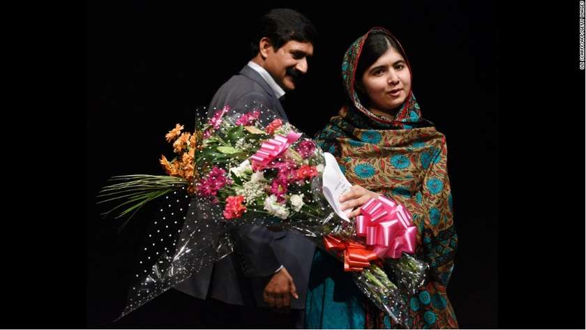 Մալալա Յուսաֆզայը ծաղկեփնջով կանգնած է Անգլիայի Բիրմինգհեմ քաղաքում՝ բեմի վրա, այն բանից հետո, երբ արժանացավ Խաղաղության Նոբելյան մրցանակի։ Երկու տարի առաջ 17-ամյա աղջիկը գլխին հրազենային վերք էր ստացել Թալիբանի կողմից՝ Պակիստանում աղջիկների կրթության քարոզչության համար։ Վիրահատությունից ապաքինվելուց հետո նա իր արշավի մասին լսելի դարձրեց արդեն ողջ աշխարհին։