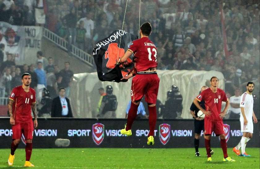 Սերբիացի ֆուտբոլիստ Ստեֆան Միտրովիչը՝ հոկտեմբերի 14-ին Սերբիայի Բելգրադ քաղաքում՝ Եվրո 2016-ի որակավորման խաղի ընթացքում։ Ալբանական խորհրդանիշերով ծածանվող դրոշը պոկելուց հետո խաղացողների միջև վեճ բռնկվեց, ինչի արդյունքում խաղը 41 րոպեից դադարեցվեց։ Խաղում արդեն իսկ լարվածություն էր նկատվում, քանի որ Սերբիան չի ընդունել Կոսովոյի (Սերբիայի նախկին շրջան, որն անկախացավ 2008թ․-ին) անկախությունը։