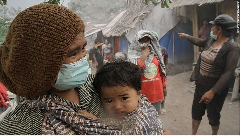 Գյուղացիները դիմակներ են կրում Ինդոնեզիայում ժայթքած Սինաբունգ լեռան հրաբխի խիտ ծխից ու մոխրից պաշտպանվելու համար։