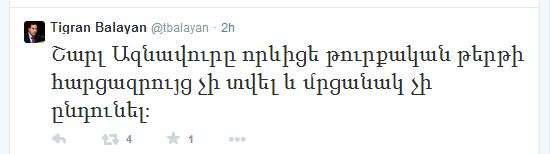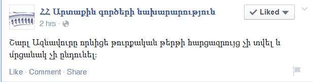 Ինչպես նաև այդ մասին թվիթերյան իր էջում գրել է ԱԳՆ մամուլի խոսնակ Տիգրան Բալայանը։