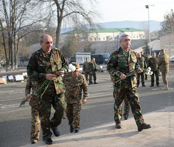 Աշխատանքային այցով Լեռնային Ղարաբաղի Հանրապետությունում գտնվող ՀՀ Նախագահ, ՀՀ զինված ուժերի գերագույն գլխավոր հրամանատար Սերժ Սարգսյանը, հայկական երկու հանրապետությունների «Միասնություն-2014» համատեղ օպերատիվ-մարտավարական զորավարժությունների շրջանակներում, Արցախի Հանրապետության Նախագահ Բակո Սահակյանի հետ այսօր առավոտյան այցելել է առանձին մոտոհրաձգային բրիգադի մշտական տեղակայման վայր, արգելագոտում դիտել ցուցադրական պարապմունքները: