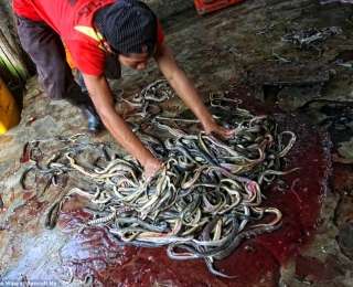 Գործարանի աշխատողները ռուլետի պես փաթաթում են մաշկազերծված օձերի դիակները։ Օձերի կաշվին օգտագործվում է շքեղ իրեր պատրաստելու համար, իսկ դրանց միսը վաճառվում է իբրև սննդամթերք։