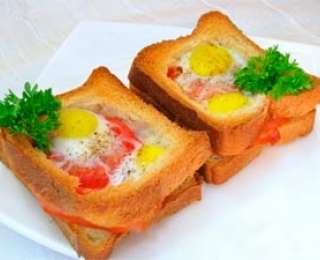 Մնացած 6 կտոր հացերը դնել հատուկ թավայի մեջ (ջեռոցային), վրան դնել երշիկի կամ խոզապուխտի կտորները, ապա միջուկն հանած հացի կտորները: Փոսիկների մեջ դնել լոլիկը, ջարդել մեկ ձու: