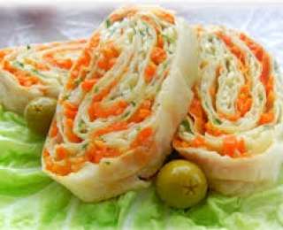 Լավաշը բացել ամբողջությամբ, վրան մայոնեզ քսել և խառնուրդի կեսը տարածել լավաշի վրա: Լավաշը զգուշությամբ փաթաթել այնպես, որ ռուլետի տեսք ստանա, այնուհետև այն բաժանել երկու մասի: