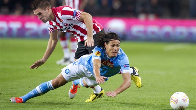 | Պահ "ՊՍՎ" - "Նապոլի" հանդիպումից, գնդակի համար պայքարում է Էդիսոն Կավանին |