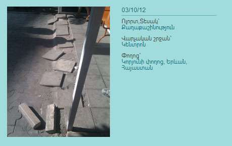 Պոլիտեխնիկի դիմացի կանգառը, որը քաղաքի ամենամարդաշատ կանգառներից է, գտնվում է քանդված վիճակում: Խնդրում եմ համապատասխան միջոցառումներ ձեռք առնել: