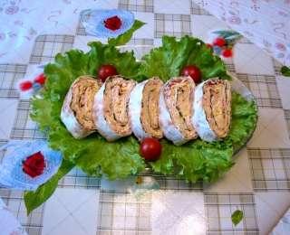 Գրտնակեք խմորը, վրան թեթև քսեք մայոնեզ, հավասարաչափ լցրեք միջուկը, փաթաթեք ռուլետաձև, վրան քսեք ձուն և կտրատեք:
