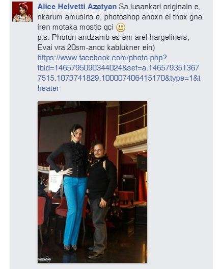 «Ուզում եմ Ձեր ուշադրությունը սևեռել այս լուսանկարի վրա։ N 1 լուսանկարում պատկերված եմ ես և Եվա Ռիվասը մեր համատեղ ֆոտոշարքից հետո։ Անխոս, Եվան բավական բարձրահասակ աղջիկ է, և եթե հաշվի առնենք բարձրակրունկները, պարզ է, որ ես իմ 170 սմ բոյով նրանից մեկ գլուխ կոլոտ եմ։ Այս լուսանկարն արդեն շատ երկար ժամանակ կա իմ ֆեյսբուքյան էջում, և, անկեղծ ասած, ինձ չէր թվում, որ առիթ կունենամ դրան անդրադառնալու։ Իսկ հիմա նաենք լուսանկար N 2-ին։ Ի՞նչ ենք մենք տեսնում։ Ինչպես տեսնում եք՝ հերիք չէ գողացել են իմ լուսանկարը, ջնջել են լոգոն և այն ֆոտոշոփի միջոցով մեծացրել են աննորմալ չափերի, որպեսզի գրեն, որ Եվա Ռիվասն «ահավոր» բոյով է.... »