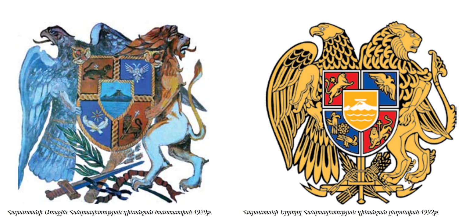 Երկու հանրապետությունների զինանշանի առավել պահպանողական հատվածը նրա կենտրոնական վահանն է, որը նաև արտահայտում է զինանշանի հիմնական գաղափարական բովանդակությունը: Դրանում ի մի բերված հայոց պատմական արքայատոհմերի խորհրդանշաններն արտահայտում են պետականության շարունակականությունը հերթական` հինգերորդ պետության զինանշանում: Չորս վահանամասերում հայոց նախորդ արքայատոհմերին վերաբերող կենդանապատկերների ուղղահայաց դիրքի փոխարինումը անկյունագծային տեղադրությամբ չունի որևէ իմաստային նշանակություն և ընդամենը ժամանակակից զինանշանի ոճավորման արդյունք է: Վահանից ներքև գտնվող պատկերներց մեկը բառային նկարագրությունում անվանվում է «գրիչ», իսկ երկրորդում` «ճյուղ»: Վերջինում նաև լրացվել է ստորին առարկաների շարքը` առաջին զինանշանի համեմատությամբ ավելացվել է ժապավեն` առանց որևէ նշանաբանի: