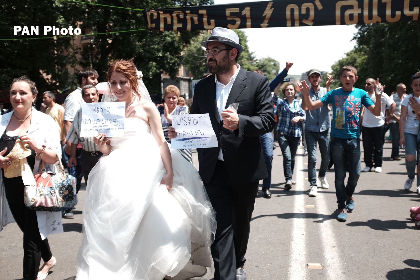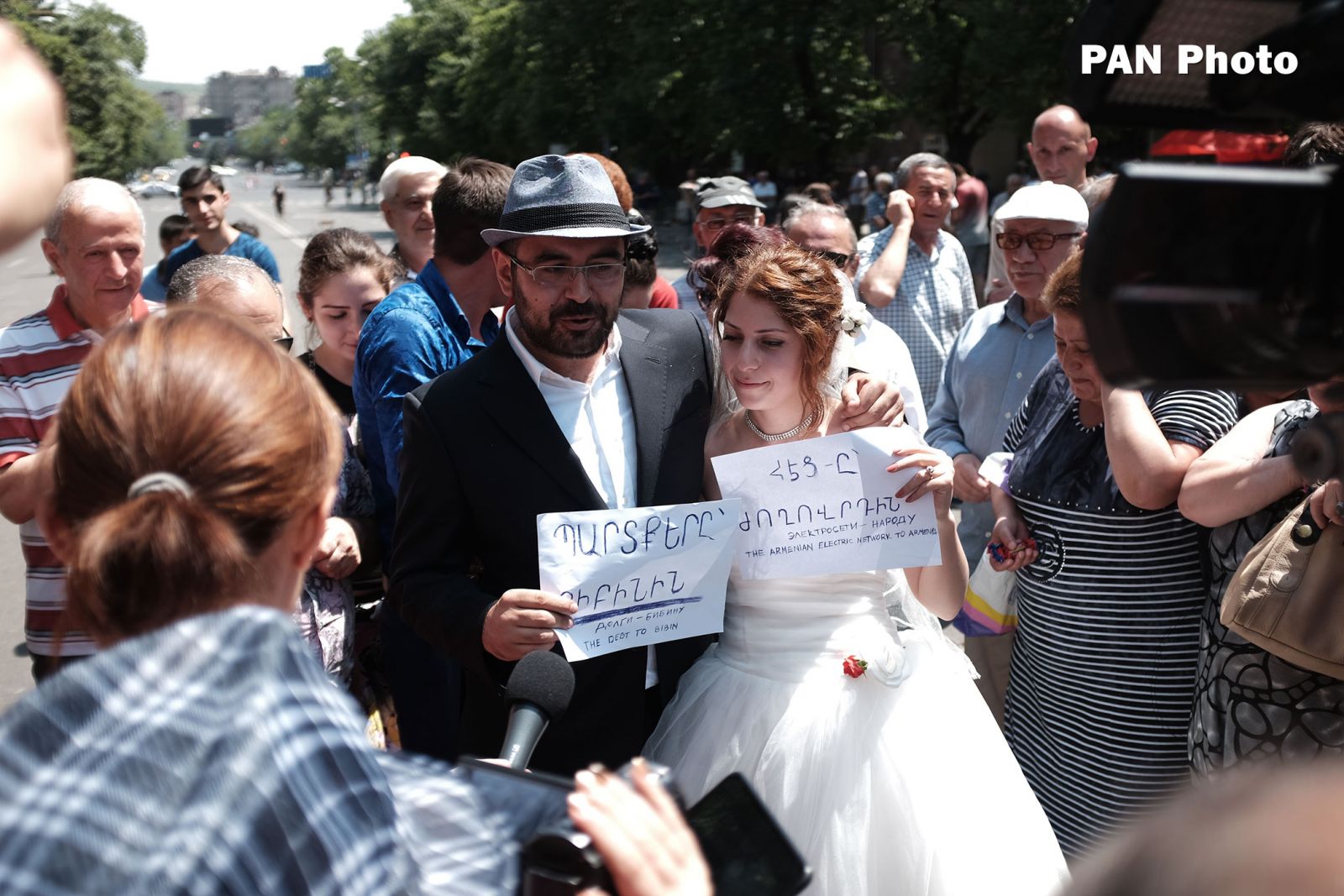 Երևանի Բաղրամյան պողոտայում էլեկտրաէներգիայի թանկացման դեմ բողոքի ակցիայի մասնակիցներին այսօր միացավ նորապսակ երիտասարդ մի զույգ։