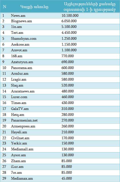 Ներկայացնում ենք հայկական առաջատար լրատվական կայքերի ամսական այցելությունների միջինացված տվյալներն՝ ըստ բրիտանական «SimilarWeb» համակարգի (2015թ. օգոստոսի 1-ի դրությամբ):