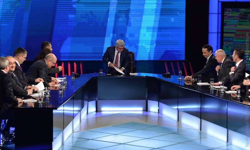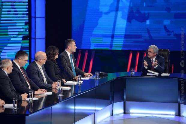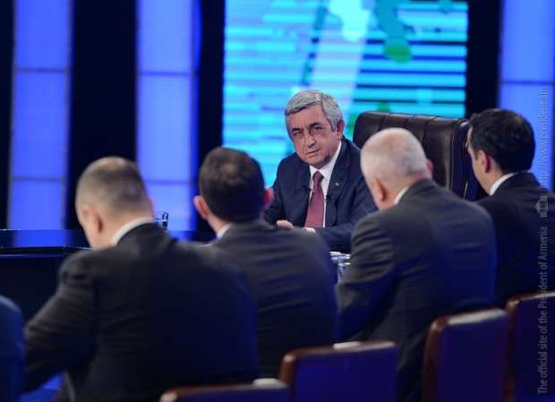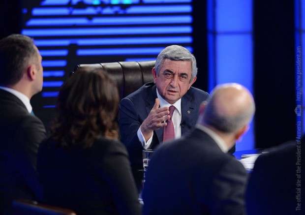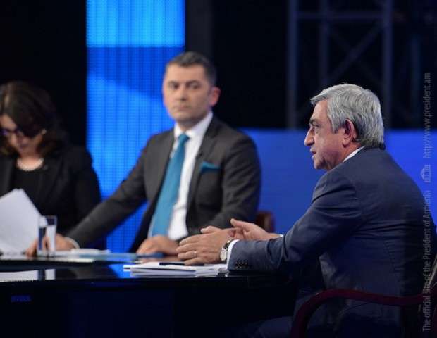 President.am–ը գրում է.Նախագահ Սերժ Սարգսյանը դեկտեմբերի 2-ի երեկոյան ծավալուն հարցազրույց է տվել հայաստանյան հեռուստաընկերությունների ներկայացուցիչներին՝ պատասխանելով նրանց բազմաթիվ հարցերին, որոնք հիմնականում վերաբերել են ՀՀ Սահմանադրության փոփոխություններին` դրանց նախաձեռնման անհրաժեշտությանն ու նպատակին, պետության համար այդ փոփոխությունների կարևորությանը, Մայր օրենքի բարեփոխմանը դեմ արտահայտվողների փաստարկներին ու դրանց հիմնավորվածությանը և այլն: Լրագրողները Նախագահից հետաքրքրվել են նաև օրերս իրավապահ մարմինների կողմից մայրաքաղաքում իրականացված հատուկ գործողության և ՀՀ ԱԱԾ քննչական վարչությունում հարուցված քրեական գործի նախաքննության ընթացքի մասին: