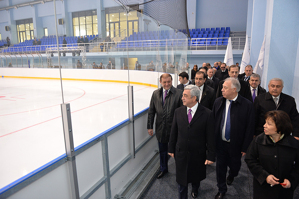 Հանրապետության Նախագահը շրջայց է կատարել գեղասահքի դպրոցում, ծանոթացել պայմաններին, ապա դիտել է դպրոցի բացման առիթով պատրաստված գեղարվեստական ծրագիրը՝ գեղասահքի ցուցադրական ելույթներով: