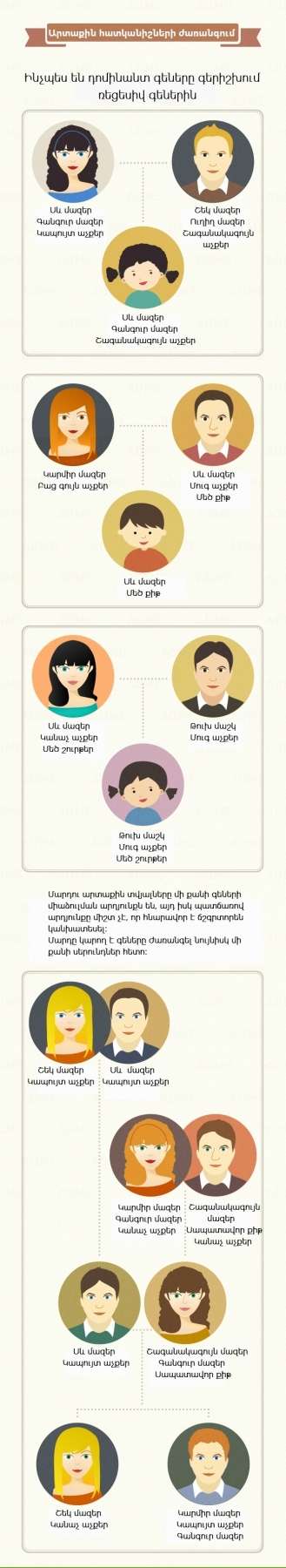 Ժամանակակից գիտությունը կարող է կանխատեսել, թե ինչ արտաքին գծեր կարող են ունենալ Ձեր ապագա երեխաները։ Ամբողջ տեղեկատվությունը կոդավորված է գեներում, որոնք կարող են դոմինանտ կամ ռեցեսիվ լինել։