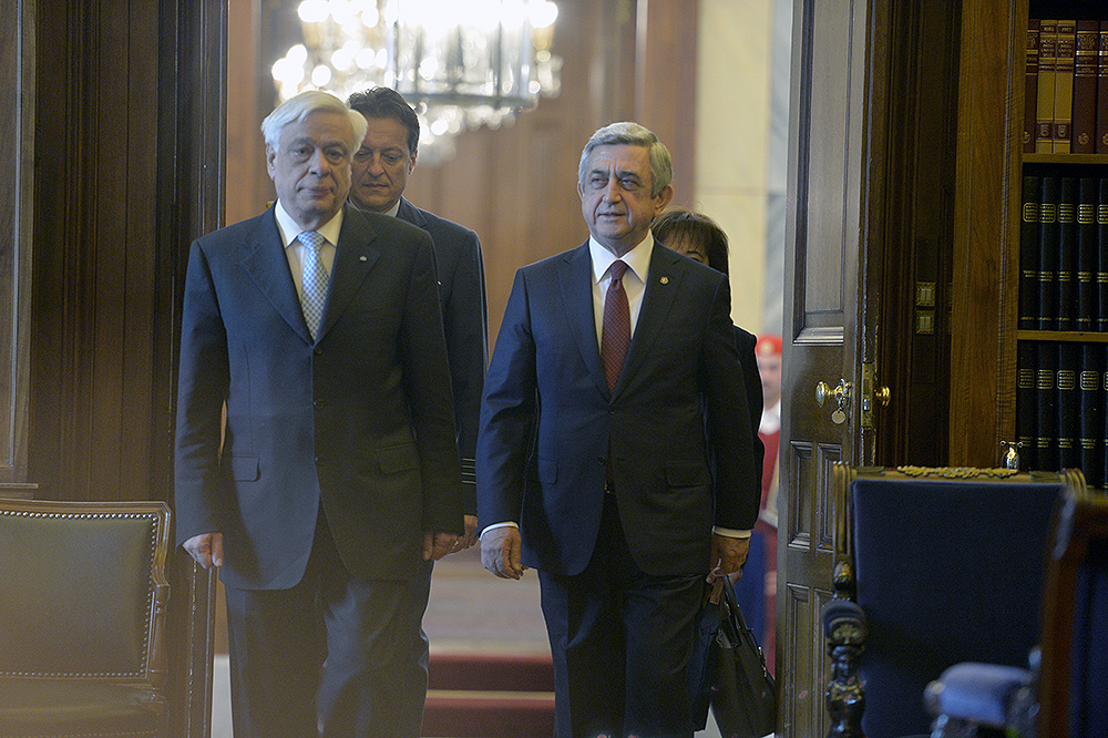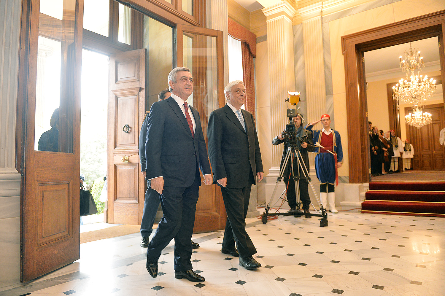 Ողջունելով ՀՀ Նախագահին և նրա գլխավորած պատվիրակությանը` Նախագահ Պրոկոպիս Պավլոպուլոսն ընդգծել է, որ Նախագահ Սերժ Սարգսյանի պաշտոնական այցը Հունաստան ևս մեկ անգամ ցույց է տալիս բոլոր ոլորտներում` քաղաքական, տնտեսական, մշակութային, երկու երկրների միջև հարաբերությունների և համագործակցության բարձր մակարդակն ու բացառիկ կարևորությունը: Նշելով, որ հայերը և հույները միմյանց հետ կապված են ամուր պատմական, բարեկամական կապերով, Նախագահ Պավլոպուլոսը շեշտել է, որ այսօրվա միջպետական հարաբերությունների հիմք դարձած այդ պատմական կապերն ամրապնդվել են դարերի ընթացքում` դժվարին պայմաններում: