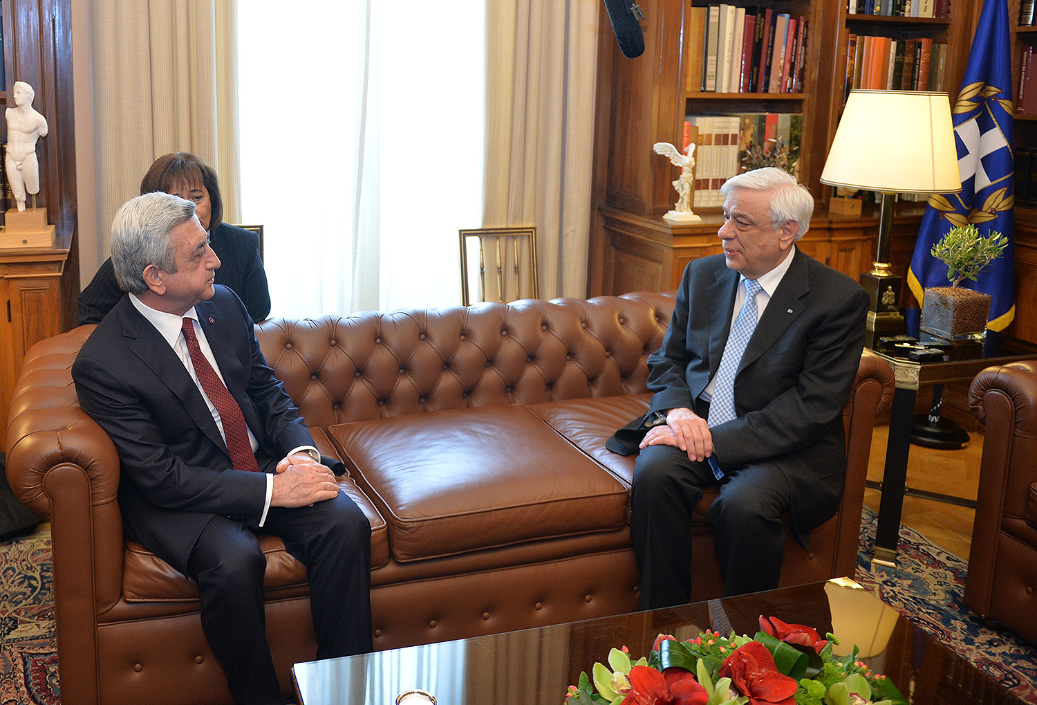 Հունաստանի Նախագահի նստավայրում ՀՀ Նախագահի դիմավորման պաշտոնական արարողությունից հետո նախագահներ Սերժ Սարգսյանը և Պրոկոպիս Պավլոպուլոսը առանձնազրույց են ունեցել: ՀՀ Նախագահը և Պրոկոպիս Պավլոպուլոսը, ով մինչ Նախագահի պաշտոնն ստանձնելը եղել է Հունաստան-Հայաստան խորհրդարանական բարեկամության խմբի անդամ և բավականաչափ տեղեկացված է Հայաստանի վերաբերյալ կարևորագույն հարցերին, քննարկել են միջպետական հարաբերությունների օրակարգին, ինչպես նաև երկկողմ և բազմակողմ` միջազգային և տարածաշրջանային կազմակերպությունների շրջանակներում համագործակցությանը, փոխշահավետ մի շարք կարևոր ոլորտներում հայ-հունական գործակցության զարգացմանը, միջխորհրդարանական կապերին, Հայոց ցեղասպանության միջազգային ճանաչման և դատապարտման գործընթացին, ԼՂ հիմնախնդրի կարգավորման բանակցային գործընթացին վերաբերող հարցեր: Նախագահներն անդրադարձել են նաև միջազգային օրակարգի մի շարք արդիական հարցերի, ներկայացրել դրանց շուրջ երկու երկրների մոտեցումները, խոսել Հայաստան-Եվրամիություն հարաբերությունների և դրանց զարգացման գործում բարեկամ Հունաստանի դերակատարության, Մերձավոր Արևելքում, մասնավորապես Սիրիայում ստեղծված ճգնաժամի և դրա հետևանքով առաջացած մարդասիրական աղետի, փախստականների ճգնաժամի հետևանքների մասին, որն այսօր համաեվրոպական խնդիր է դարձել, իսկ Հունաստանի կառավարության համար՝ ամենօրյա լուրջ մարտահրավեր: