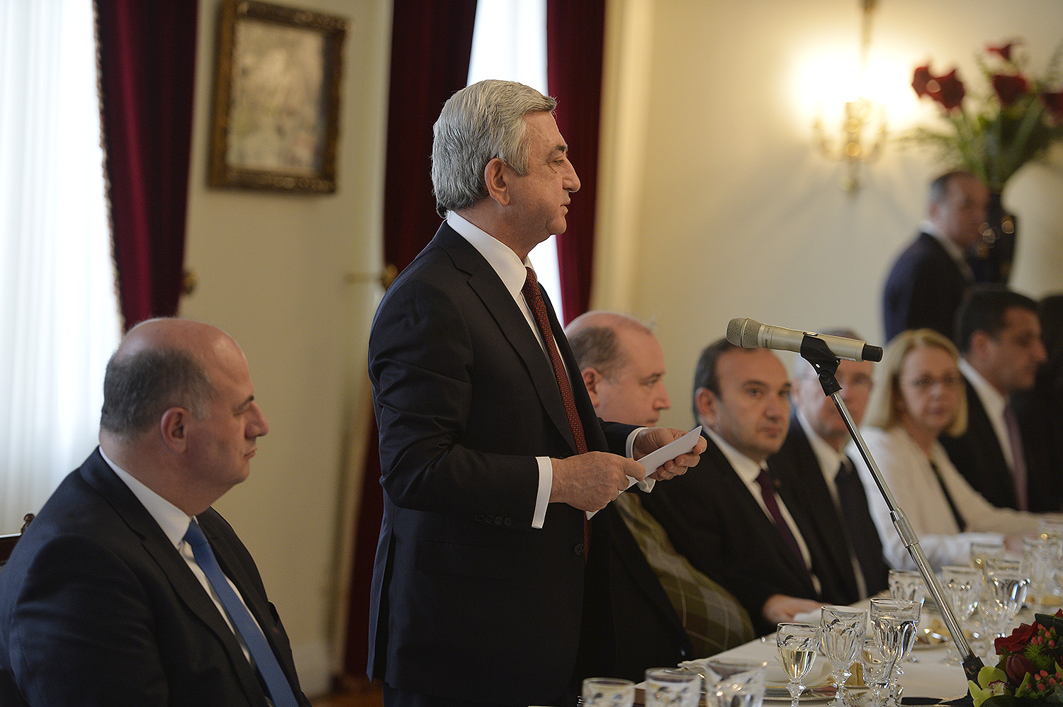 Այսօր մենք ունենք հագեցած երկկողմ օրակարգ՝ քաղաքական գործուն երկխոսությունից մինչև համագործակցություն կրթության և մշակույթի բնագավառներում: Սերտորեն փոխգործակցում ենք ռազմական ոլորտում: Հայաստան-Եվրոպական Միություն հարաբերություններում Հունաստանը մեր կարևորագույն գործընկերներից է: Պարբերական դարձած բարձրաստիճան փոխայցելությունները հնարավորություն են տալիս ուրվագծել համագործակցության նոր հնարավորություններ: Ասածիս վառ վկայությունն իմ այս այցն է, որի հիմնական նպատակն է նոր մակարդակի բարձրացնել մեր տնտեսական համագործակցությունը՝ հիմնվելով առկա ներուժի վրա»,-ասել է Նախագահ Սերժ Սարգսյանը և առաջարկել բաժակ բարձրացնել հանուն հայ և հույն ժողովուրդների դարավոր պատմության, հանուն ներկա բարեկամության և ապագա սերունդների հարատև համակեցության: